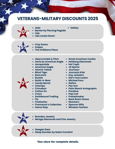 Brandon Exchange proudly supports those that serve, their families, and our veterans. Receive special discount offers at participating stores with valid military ID.